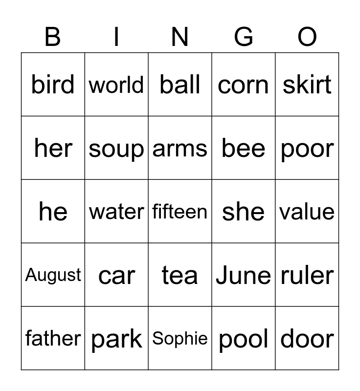 This bingo card has a free space and 24 words: car, park, arms, father, skirt, bird, her, world, she, tea, bee, he, June, ruler, soup, pool, value, ball, poor, water, door, August, corn and Sophie.