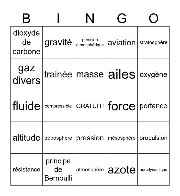 This bingo card has a free space and 24 words: troposphère, principe de Bernoulli, masse, résistance, stratosphère, dioxyde de carbone, gaz divers, gravité, force, pression, ailes, fluide, mésosphère, propulsion, trainée, azote, portance, pression atmosphérique, oxygène, compressible, aérodynamique, altitude, aviation and atmosphère.