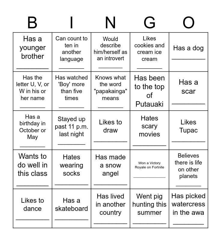 This bingo card has 25 words: Hates wearing socks _________, Has lived in another country _________, Knows what the word "papakainga" means ________, Likes to dance _________, Has a dog _________, Has a younger brother ________, Has the letter U, V, or W in his or her name ________, Can count to ten in another language ________, Hates scary movies _________, Has made a snow angel _________, Has been to the top of Putauaki, Has a birthday in October or May ________, Won a Victory Royale on Fortnite ________________, Believes there is life on other planets ________, Has watched 'Boy' more than five times ________, Has picked watercress in the awa ________, Likes Tupac _________, Would describe him/herself as an introvert ________, Has a scar ________, Stayed up past 11 p.m. last night ________, Likes to draw _________, Has a skateboard _________, Wants to do well in this class ________, Likes cookies and cream ice cream ________ and Went pig hunting this summer _________.