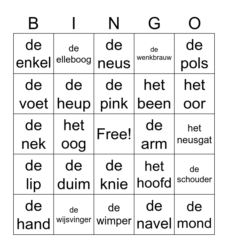 This bingo card has a free space and 24 words: de duim, de wijsvinger, de pink, de hand, de pols, de enkel, de voet, de elleboog, de arm, de knie, het been, de nek, het hoofd, de schouder, de heup, de navel, het neusgat, de neus, het oor, het oog, de mond, de lip, de wenkbrauw and de wimper.