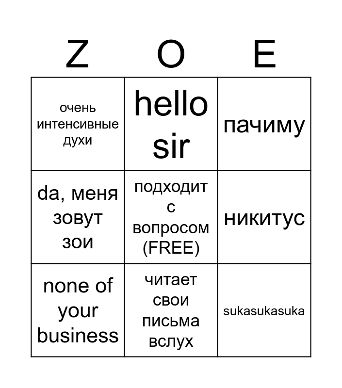 This bingo card has a free space and 14 words: Sportskeeda, interesting..., none of your business, hello sir, da, меня зовут зои, sukasukasuka, salam popolam sam cho kak, i'm alive, читает свои письма вслух, очень интенсивные духи, заиграла музыка через динамики, никитус, пачиму and sÜsha.