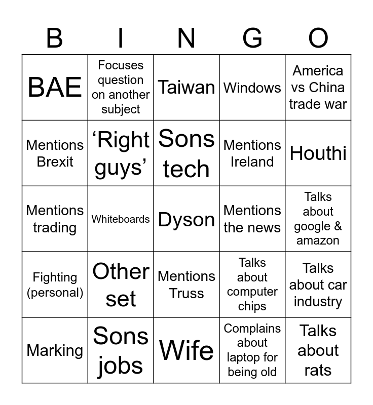 This bingo card has a free space and 24 words: Other set, Sons jobs, Sons tech, Marking, America vs China trade war, BAE, Mentions Brexit, Focuses question on another subject, Mentions the news, Mentions Truss, Mentions Ireland, Mentions trading, Talks about computer chips, Talks about car industry, ‘Right guys’, Complains about laptop for being old, Talks about google & amazon, Taiwan, Houthi, Whiteboards, Talks about rats, Fighting (personal), Windows and Wife.