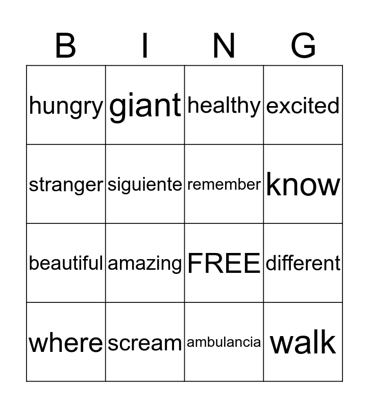 This bingo card has a free space and 15 words: where, walk, healthy, hungry, know, stranger, amazing, ambulancia, siguiente, beautiful, different, excited, remember, giant and scream.