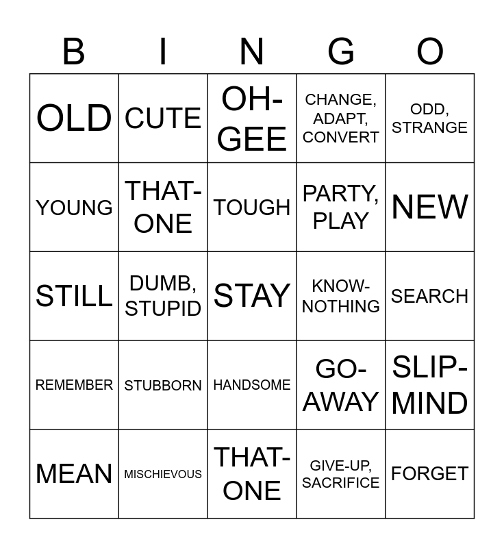 This bingo card has a free space and 24 words: STUBBORN, MISCHIEVOUS, TOUGH, MEAN, ODD, STRANGE, OLD, YOUNG, CUTE, KNOW-NOTHING, HANDSOME, PARTY, PLAY, STILL, GO-AWAY, SLIP-MIND, THAT-ONE, GIVE-UP, SACRIFICE, SEARCH, OH-GEE, NEW, DUMB, STUPID, FORGET, REMEMBER, CHANGE, ADAPT, CONVERT and THAT-ONE.