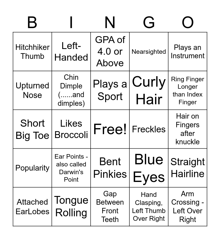 This bingo card has a free space and 24 words: Ear Points - also called Darwin's Point, Tongue Rolling, Plays a Sport, Attached EarLobes, Plays an Instrument, Hitchhiker Thumb, Upturned Nose, Left-Handed, Freckles, Bent Pinkies, Curly Hair, Short Big Toe, Blue Eyes, Straight Hairline, Chin Dimple (......and dimples), Hand Clasping, Left Thumb Over Right, Hair on Fingers after knuckle, GPA of 4.0 or Above, Ring Finger Longer than Index Finger, Likes Broccoli, Arm Crossing - Left Over Right, Popularity, Nearsighted and Gap Between Front Teeth.