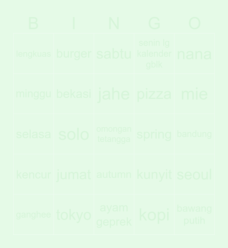 This bingo card has 25 words: jumat, ayam geprek, jahe, ganghee, nana, lengkuas, minggu, burger, spring, autumn, pizza, selasa, kunyit, seoul, bekasi, bawang putih, bandung, sabtu, mie, solo, omongan tetangga, tokyo, kencur, senin lg kalender gblk and kopi.