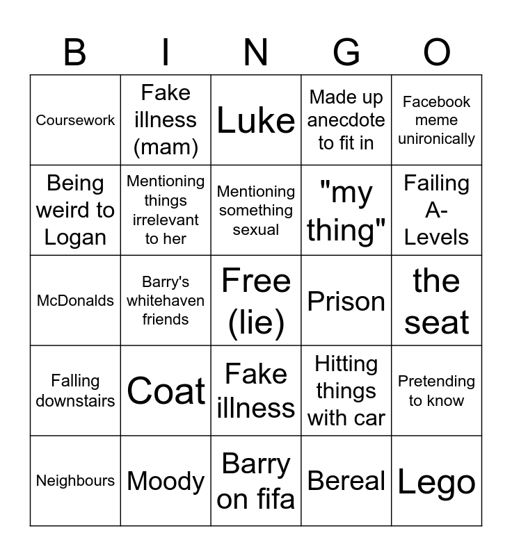 This bingo card has a free space and 43 words: Trains, Lego, Ear, Neighbours, Car, Bereal, Luke, Imtiyaz, Facebook meme unironically, Moody, Made up anecdote to fit in, Prison, Fake illness, Coat, Barry, Barry on fifa, Treadmill, McDonalds, Being poor, Failing A-Levels, Fake illness (mam), Being "rude", Beez, Coursework, Jacket potato, the seat, exaggeration, repeats story we've already heard, Hitting things with car, Falling downstairs, Derron, Pretending to know, Talking extra loud to get attention, Barry's whitehaven friends, Interrupts, "Baby poo", Connor JJ, Mentioning something sexual, Being weird to Logan, "my thing", copying things kay does, Mentioning things irrelevant to her and Pretending she knows Will/Harry/ Thomas Price.