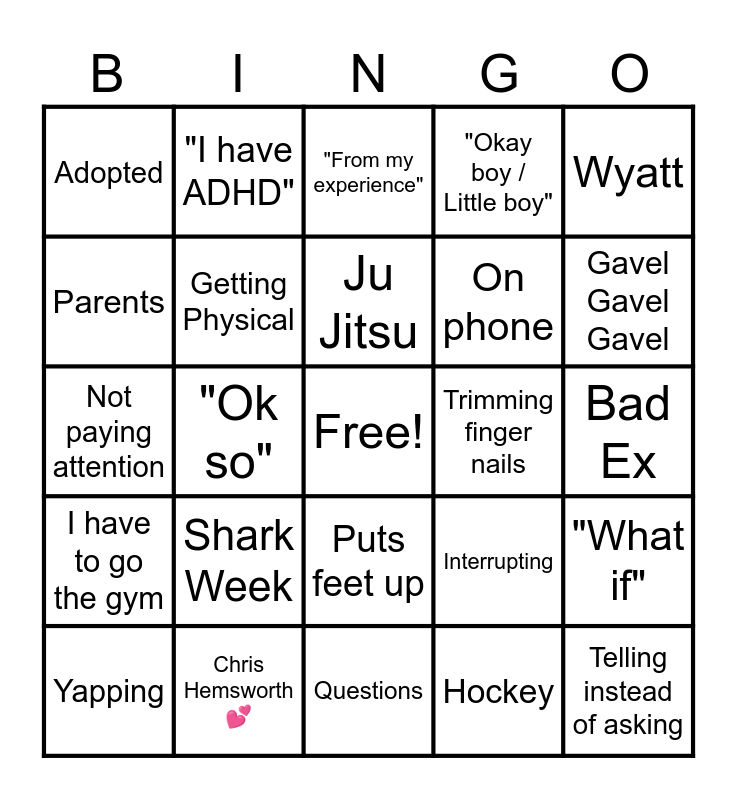 This bingo card has a free space and 25 words: Shark Week, Questions, Ju Jitsu, Yapping, Wyatt, Adopted, Parents, "I have ADHD", Trimming finger nails, Puts feet up, On phone, Not paying attention, Interrupting, "What if", Getting Physical, "I hate men", Bad Ex, "From my experience", Gavel Gavel Gavel, "Ok so", Telling instead of asking, Chris Hemsworth 💕, I have to go the gym, "Okay boy / Little boy" and Hockey.