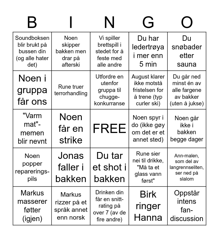This bingo card has a free space and 24 words: Jonas faller i bakken, Markus rizzer på et språk annet enn norsk, Utfordre en utenfor gruppa til chugge-konkurranse, Markus masserer føtter (igjen), Du snøbader etter sauna, Soundboksen blir brukt på bussen din (og alle hater det), Noen i gruppa får ons, Noen skipper bakken men drar på afterski, Noen spyr i do (ikke gøy om det er et annet sted), Du tar et shot i bakken, August klarer ikke motstå fristelsen for å trene (typ curler ski), "Varm mat"-memen blir nevnt, Rune sier nei til drikke, "Må ta et glass vann først", Ann-malen, som del av langrennseliten, ser ned på slalom, Rune truer terrorhandling, Birk ringer Hanna, Noen går ikke i bakken begge dager, Vi spiller brettspill i stedet for å feste med alle andre, Du går ned minst én av alle fargene av bakker (uten å jukse), Noen får en strike, Oppstår intens fan-discussion, Noen popper reparerings-pils, Du har ledertrøya i mer enn 5 min and Drinken din får en snitt-rating på over 7 (av de fire andre).
