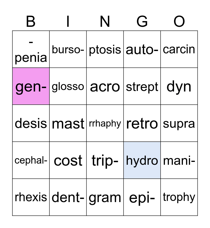 This bingo card has 25 words: cost, gram, acro, rhexis, carcin, -penia, gen-, burso-, retro, trip-, strept, desis, hydro, mani-, glosso, trophy, supra, ptosis, dyn, mast, rrhaphy, dent-, cephal-, auto- and epi-.
