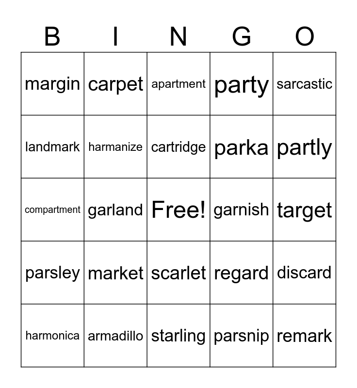 This bingo card has a free space and 29 words: pardon, armadillo, apartment, sonar, sarcastic, margin, harmanize, cartridge, garnish, discard, harmonica, garland, parsnip, remark, compartment, bombard, starling, regard, partly, parsley, market, parchment, parka, target, landmark, carpet, scarlet, party and starfish.