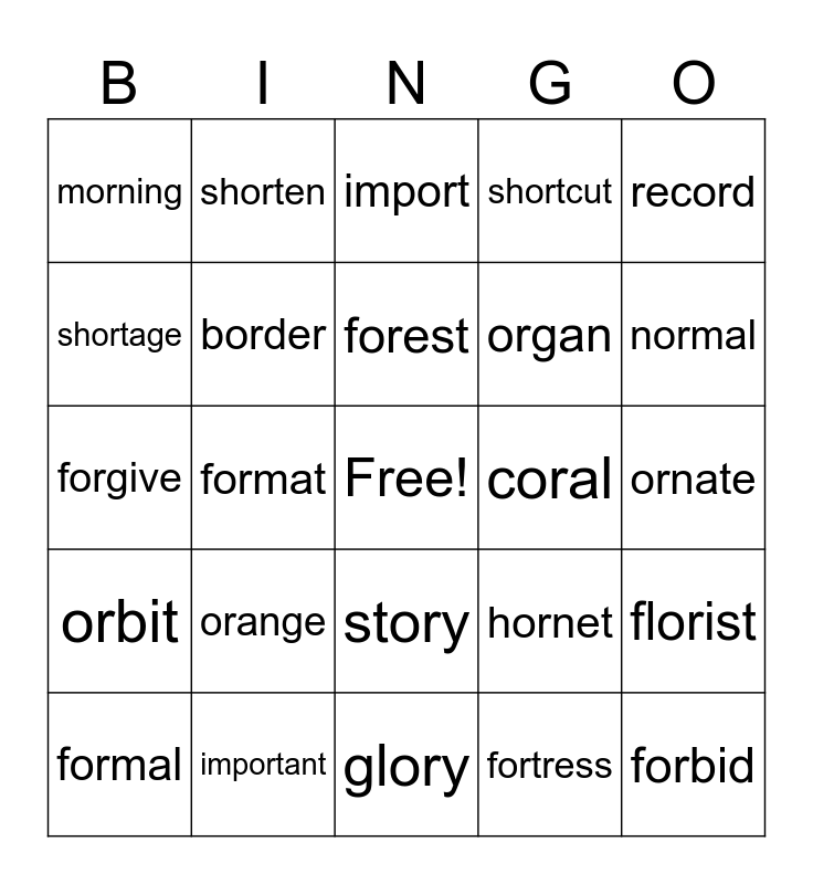 This bingo card has a free space and 29 words: forget, important, import, export, record, morning, border, forest, coral, florist, formal, format, fortress, forbid, forgive, forlorn, glory, hornet, normal, orbit, orange, torso, organ, ornate, shortage, shorten, story, shortcut and acorn.