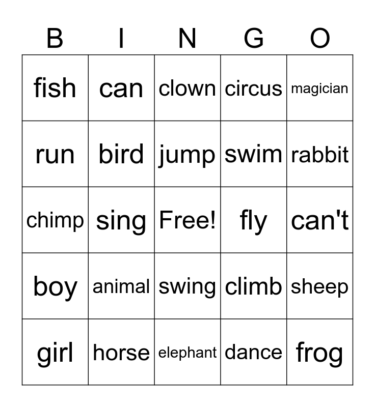This bingo card has a free space and 24 words: animal, horse, jump, girl, magician, fish, run, can, fly, swing, swim, chimp, climb, sheep, bird, dance, can't, clown, rabbit, sing, frog, boy, circus and elephant.