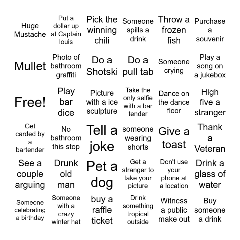 This bingo card has 36 words: Get a stranger to take your picture, Pet a dog, Drink something tropical outside, Mullet, Get carded by a bartender, Take the only selfie with a bar tender, Photo of bathroom graffiti, buy a raffle ticket, Throw a frozen fish, Don't use your phone at a location, Play a song on a jukebox, Someone spills a drink, Drink a glass of water, Play bar dice, Do a pull tab, Huge Mustache, See a couple arguing, Dance on the dance floor, Free!, Pick the winning chili, Picture with a ice sculpture, No bathroom this stop, someone wearing shorts, Tell a joke, Give a toast, Put a dollar up at Captain louis, Someone crying, Someone with a crazy winter hat, Do a Shotski, Purchase a souvenir, Buy someone a drink, Someone celebrating a birthday, Thank a Veteran, High five a stranger, Drunk old man and Witness a public make out.