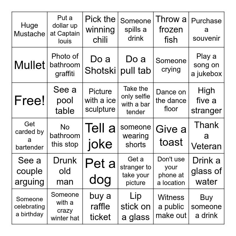 This bingo card has 36 words: Get a stranger to take your picture, Pet a dog, Lip stick on a glass, Mullet, Get carded by a bartender, Take the only selfie with a bar tender, Photo of bathroom graffiti, buy a raffle ticket, Throw a frozen fish, Don't use your phone at a location, Play a song on a jukebox, Someone spills a drink, Drink a glass of water, See a pool table, Do a pull tab, Huge Mustache, See a couple arguing, Dance on the dance floor, Free!, Pick the winning chili, Picture with a ice sculpture, No bathroom this stop, someone wearing shorts, Tell a joke, Give a toast, Put a dollar up at Captain louis, Someone crying, Someone with a crazy winter hat, Do a Shotski, Purchase a souvenir, Buy someone a drink, Someone celebrating a birthday, Thank a Veteran, High five a stranger, Drunk old man and Witness a public make out.