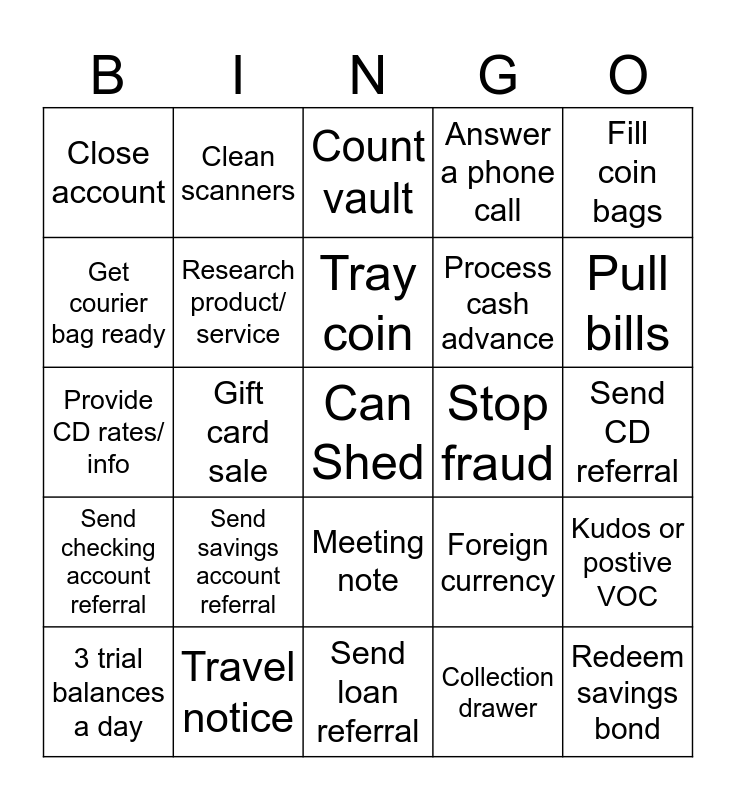 This bingo card has 25 words: Send checking account referral, Travel notice, Can Shed, Collection drawer, Fill coin bags, Close account, Clean scanners, Count vault, Stop fraud, Kudos or postive VOC, Get courier bag ready, Research product/ service, Send loan referral, Foreign currency, Pull bills, 3 trial balances a day, Gift card sale, Tray coin, Process cash advance, Send CD referral, Provide CD rates/ info, Send savings account referral, Meeting note, Answer a phone call and Redeem savings bond.