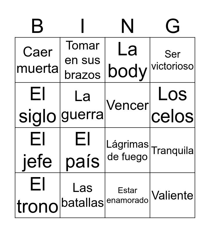 This bingo card has a free space and 15 words: El trono, Valiente, La body, Caer muerta, Los celos, El siglo, El país, Estar enamorado, La guerra, El jefe, Tranquila, Ser victorioso, Vencer, Tomar en sus brazos and Las batallas.