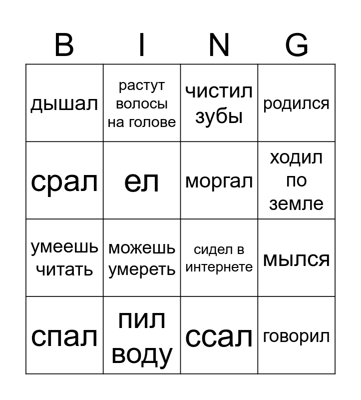 This bingo card has 16 words: пил воду, мылся, чистил зубы, дышал, умеешь читать, растут волосы на голове, сидел в интернете, ссал, срал, ел, спал, родился, можешь умереть, ходил по земле, моргал and говорил.