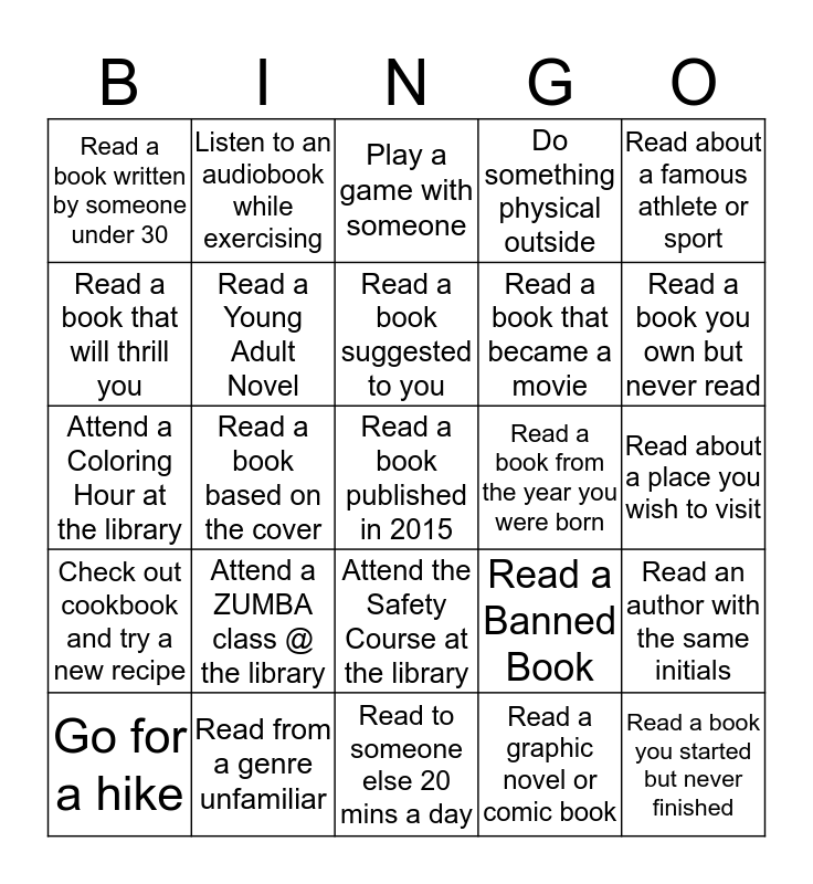 This bingo card has 25 words: Attend a ZUMBA class @ the library, Read to someone else 20 mins a day, Read a book suggested to you, Go for a hike, Read about a famous athlete or sport, Read a book written by someone under 30, Read a book that will thrill you, Listen to an audiobook while exercising, Read a book from the year you were born, Attend the Safety Course at the library, Read a book that became a movie, Attend a Coloring Hour at the library, Read a Banned Book, Read an author with the same initials, Read a Young Adult Novel, Read a book you started but never finished, Read about a place you wish to visit, Play a game with someone, Read a book you own but never read, Read a book based on the cover, Read a book published in 2015, Read from a genre unfamiliar, Check out cookbook and try a new recipe, Do something physical outside and Read a graphic novel or comic book.