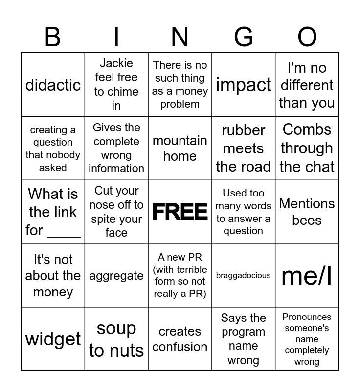 This bingo card has a free space and 24 words: aggregate, soup to nuts, mountain home, widget, I'm no different than you, didactic, creating a question that nobody asked, Jackie feel free to chime in, Used too many words to answer a question, A new PR (with terrible form so not really a PR), rubber meets the road, What is the link for ____, braggadocious, me/I, Gives the complete wrong information, Says the program name wrong, Mentions bees, There is no such thing as a money problem, Combs through the chat, Cut your nose off to spite your face, Pronounces someone's name completely wrong, It's not about the money, impact and creates confusion.