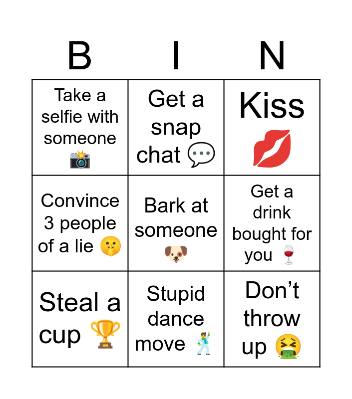 This bingo card has a free space and 8 words: Get a drink bought for you 🍷, Kiss 💋, Get a snap chat 💬, Steal a cup 🏆, Take a selfie with someone📸, Don’t throw up 🤮, Convince 3 people of a lie 🤫 and Stupid dance move 🕺.