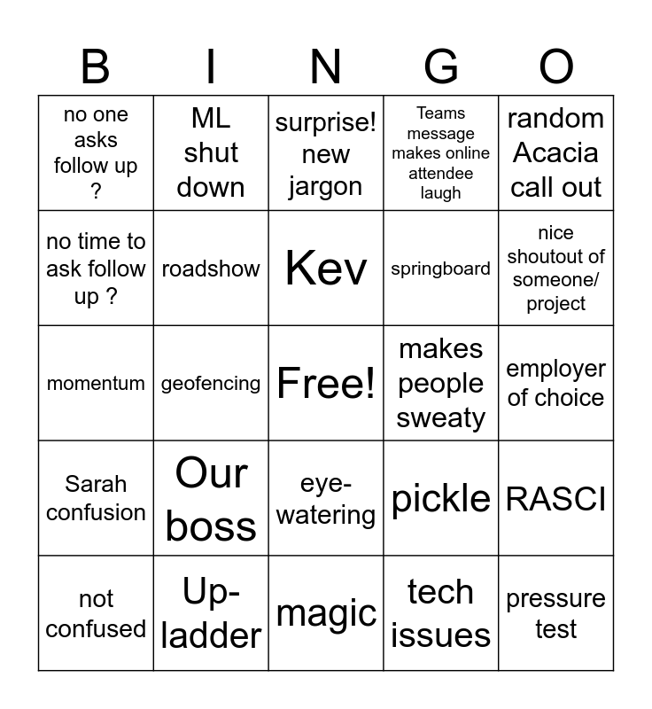 This bingo card has a free space and 24 words: Our boss, Up-ladder, Kev, not confused, random Acacia call out, no one asks follow up ?, no time to ask follow up ?, ML shut down, makes people sweaty, eye-watering, springboard, momentum, pickle, RASCI, roadshow, tech issues, employer of choice, surprise! new jargon, nice shoutout of someone/ project, geofencing, pressure test, Sarah confusion, Teams message makes online attendee laugh and magic.