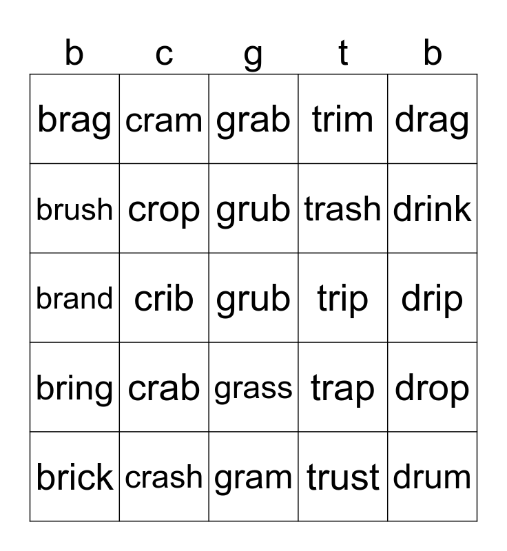 This bingo card has a free space and 24 words: brick, crab, grub, trust, drag, brag, cram, grab, trip, drip, brand, crop, trap, drop, brush, crash, gram, trim, drink, bring, crib, grass, trash and drum.