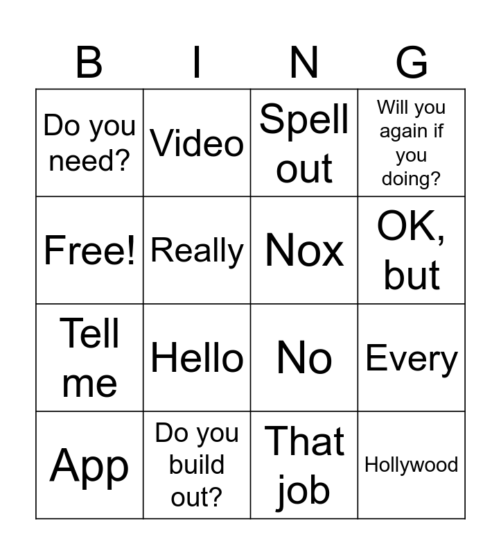 This bingo card has 16 words: Do you build out?, Every, Spell out, Do you need?, Tell me, Video, No, That job, Free!, Really, App, Will you again if you doing?, Hello, OK, but, Nox and Hollywood.