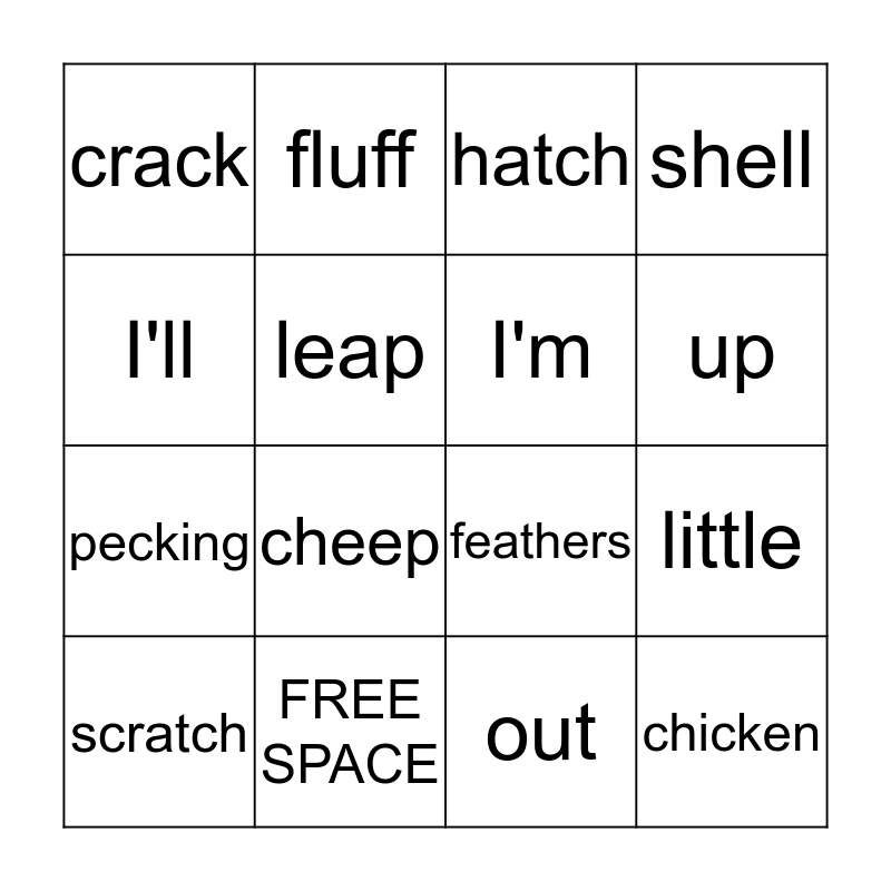 This bingo card has 16 words: FREE SPACE, little, hatch, crack, pecking, fluff, feathers, out, I'll, leap, scratch, shell, cheep, up, I'm and chicken.
