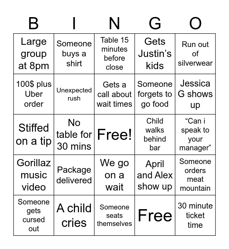 This bingo card has a free space and 30 words: A child cries, Fire alarm goes off, No table for 30 mins, No table for 1 hour, Large group at 8pm, Table 15 minutes before close, Unexpected rush, We go on a wait, Child walks behind bar, Someone seats themselves, “Can i speak to your manager”, 30 minute ticket time, Free, Donnies famous one liners, Jessica G shows up, Tame impala video, April and Alex show up, Gorillaz music video, Package delivered, Run out of silverwear, Stiffed on a tip, 30% plus tip, Someone buys a shirt, Someone forgets to go food, 100$ plus Uber order, Gets Justin’s kids, Someone orders meat mountain, Someone gets cursed out, Gets a call about wait times and Complaint about the bathrooms.
