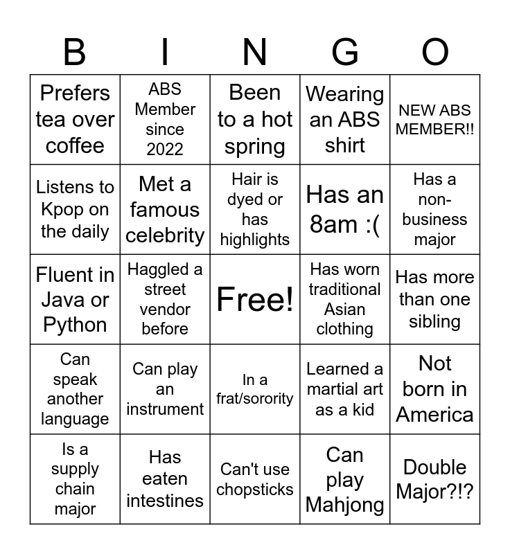 This bingo card has a free space and 24 words: Can play an instrument, Has eaten intestines, Hair is dyed or has highlights, Is a supply chain major, NEW ABS MEMBER!!, Prefers tea over coffee, Listens to Kpop on the daily, ABS Member since 2022, Has worn traditional Asian clothing, In a frat/sorority, Has an 8am :(, Fluent in Java or Python, Learned a martial art as a kid, Not born in America, Met a famous celebrity, Can play Mahjong, Has more than one sibling, Been to a hot spring, Has a non-business major, Haggled a street vendor before, Double Major?!?, Can speak another language, Wearing an ABS shirt and Can't use chopsticks.