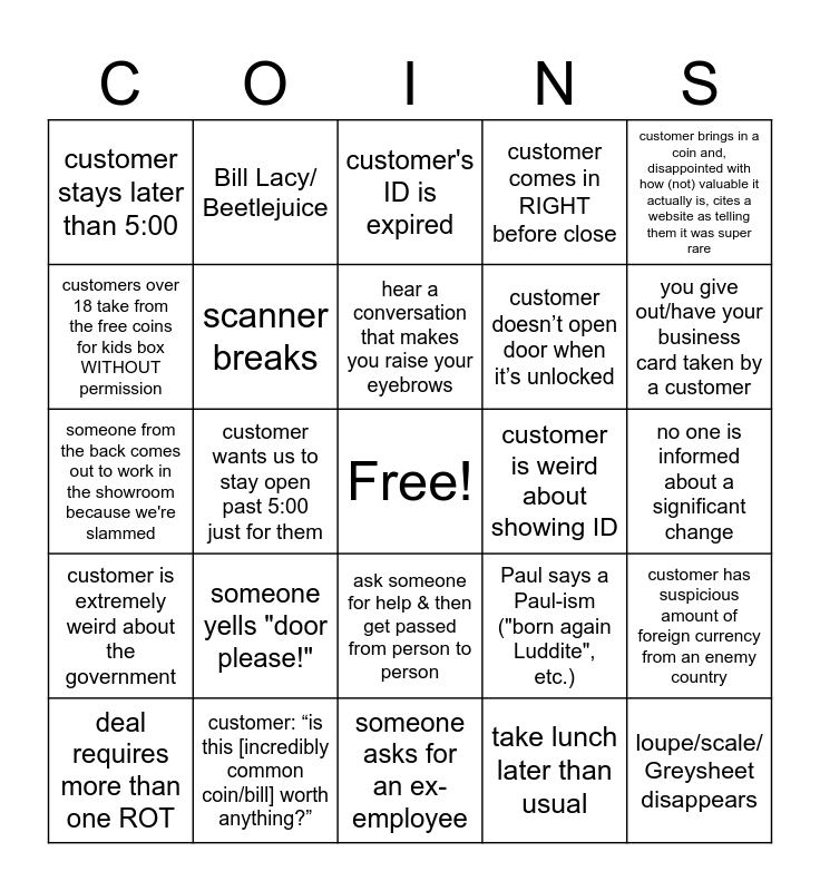 This bingo card has a free space and 24 words: someone yells "door please!", customer: “is this [incredibly common coin/bill] worth anything?”, hear a conversation that makes you raise your eyebrows, deal requires more than one ROT, customer brings in a coin and, disappointed with how (not) valuable it actually is, cites a website as telling them it was super rare, customer stays later than 5:00, customers over 18 take from the free coins for kids box WITHOUT permission, Bill Lacy/ Beetlejuice, customer is weird about showing ID, ask someone for help & then get passed from person to person, customer doesn’t open door when it’s unlocked, someone from the back comes out to work in the showroom because we're slammed, Paul says a Paul-ism ("born again Luddite", etc.), customer has suspicious amount of foreign currency from an enemy country, scanner breaks, take lunch later than usual, no one is informed about a significant change, customer's ID is expired, you give out/have your business card taken by a customer, customer wants us to stay open past 5:00 just for them, loupe/scale/ Greysheet disappears, customer is extremely weird about the government, customer comes in RIGHT before close and someone asks for an ex-employee.