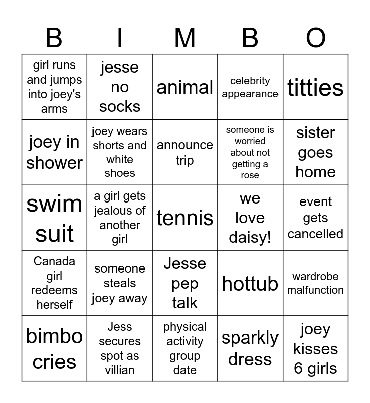 This bingo card has a free space and 29 words: bimbo cries, joey cries, a girl gets jealous of another girl, someone drinks a beer, girl runs and jumps into joey's arms, animal, joey wears shorts and white shoes, someone steals joey away, we love daisy!, Jess secures spot as villian, event gets cancelled, joey kisses 6 girls, physical activity group date, sparkly dress, sister goes home, Jesse announces a date, Jesse pep talk, Canada girl redeems herself, titties, swim suit, hottub, someone talks about charity, someone is worried about not getting a rose, joey in shower, celebrity appearance, jesse no socks, wardrobe malfunction, announce trip and lizard/ bug.