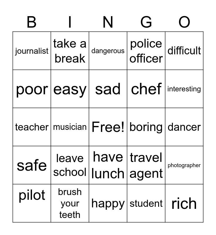 This bingo card has a free space and 24 words: pilot, leave school, sad, student, difficult, journalist, take a break, dangerous, boring, dancer, teacher, easy, travel agent, photographer, poor, brush your teeth, happy, police officer, interesting, safe, musician, have lunch, chef and rich.