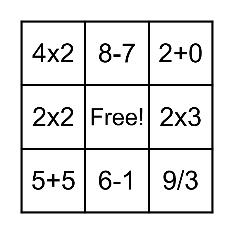 This bingo card has a free space and 8 words: 2x3, 2+0, 8-7, 5+5, 4x2, 9/3, 2x2 and 6-1.