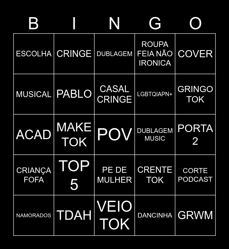 This bingo card has a free space and 24 words: TOP 5, TDAH, CASAL CRINGE, NAMORADOS, COVER, ESCOLHA, MUSICAL, CRINGE, DUBLAGEM MUSIC, PE DE MULHER, LGBTQIAPN+, ACAD, CRENTE TOK, CORTE PODCAST, PABLO, DANCINHA, PORTA 2, DUBLAGEM, GRINGO TOK, MAKE TOK, GRWM, CRIANÇA FOFA, ROUPA FEIA NÃO IRONICA and VEIO TOK.