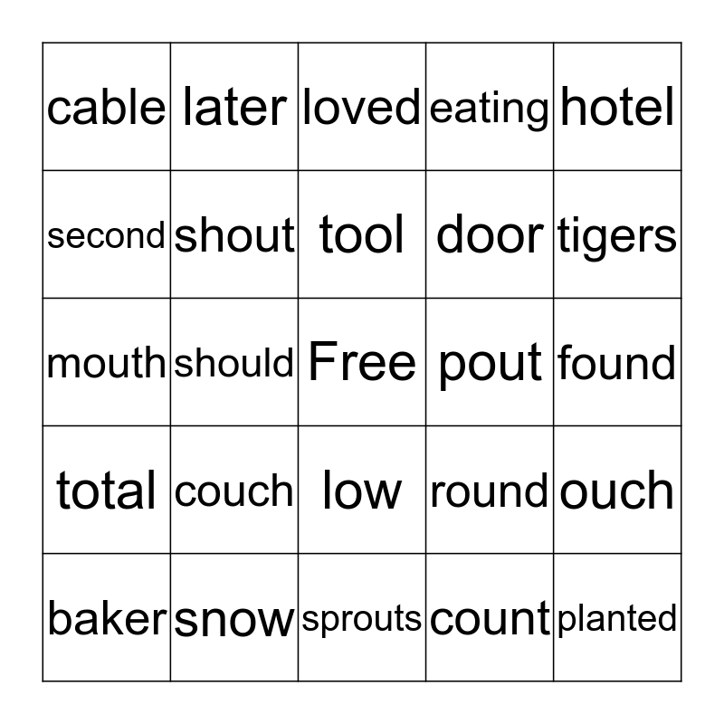 This bingo card has a free space and 24 words: couch, snow, tool, baker, hotel, cable, second, later, pout, low, door, mouth, round, ouch, shout, count, found, loved, tigers, should, planted, total, eating and sprouts.