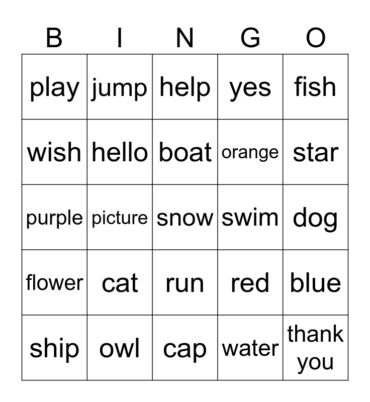 This bingo card has 25 words: cat, cap, boat, ship, fish, play, wish, jump, swim, run, orange, purple, red, blue, hello, thank you, dog, help, star, picture, snow, owl, flower, yes and water.