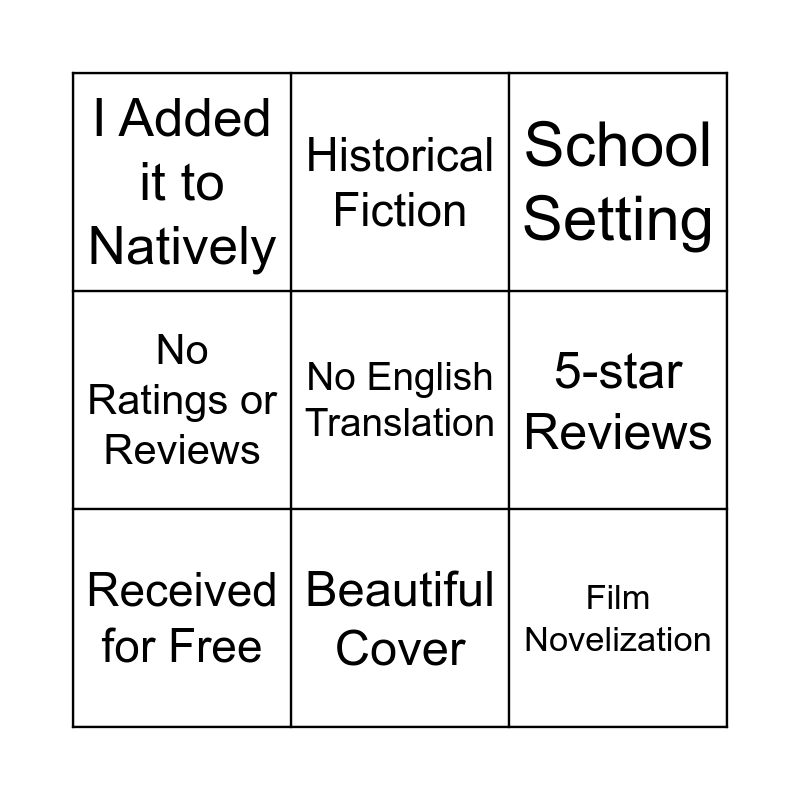 This bingo card has 9 words: Received for Free, School Setting, Historical Fiction, No Ratings or Reviews, I Added it to Natively, 5-star Reviews, No English Translation, Film Novelization and Beautiful Cover.