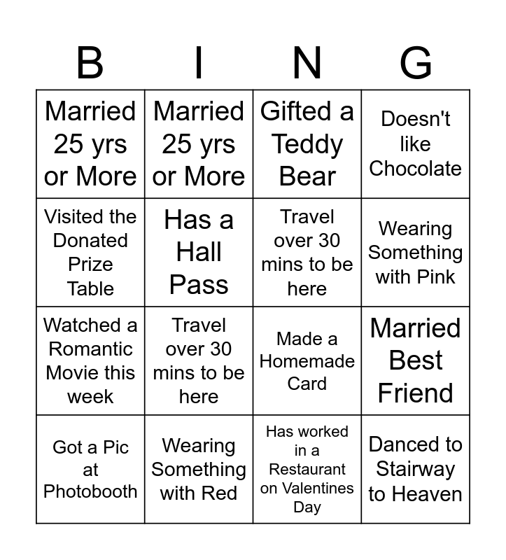 ⚠ This card has duplicate items: Visited the Donated Prize Table (2), Got a Pic at Photobooth (2), Wearing Something with Red (2), Married Best Friend (2), Married 10 yrs or More (2), Married 25 yrs or More (2), Has a Hall Pass (2), Was born in February (2), Travel over 30 mins to be here (2), Doesn't like Chocolate (2), Danced to a Boyz II Men song (2), Danced to Stairway to Heaven (2), Owned a disc Man (2), Owned an 8 track Cassette (2)