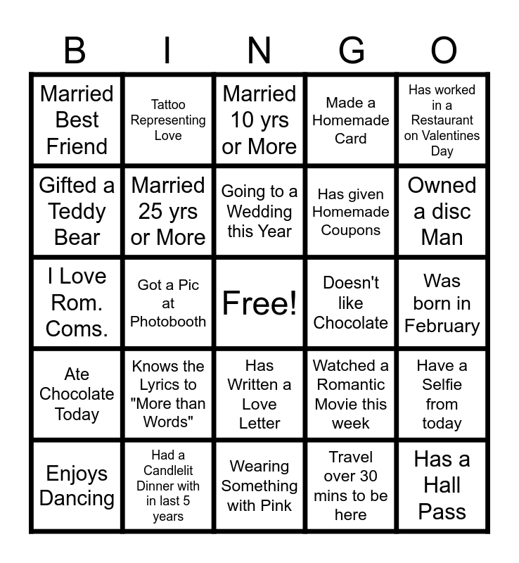 This bingo card has a free space and 31 words: Wearing Something with Pink, Wearing Something with Red, Got a Pic at Photobooth, Visited the Donated Prize Table, Married Best Friend, Married 10 yrs or More, Married 25 yrs or More, Watched a Romantic Movie this week, Doesn't like Chocolate, Travel over 30 mins to be here, Was born in February, Has a Hall Pass, Danced to a Boyz II Men song, Danced to Stairway to Heaven, Owned a disc Man, Owned an 8 track Cassette, Have a Selfie from today, Knows the Lyrics to "More than Words", Ate Chocolate Today, Has Written a Love Letter, Has worked in a Restaurant on Valentines Day, Has Bought Chocolate 50% off after 2/15, Enjoys Dancing, Tattoo Representing Love, Has given Homemade Coupons, Gifted a Teddy Bear, Made a Homemade Card, I Love Rom. Coms., Had a Candlelit Dinner with in last 5 years, Going to a Wedding this Year and Went to a Wedding in 2023.