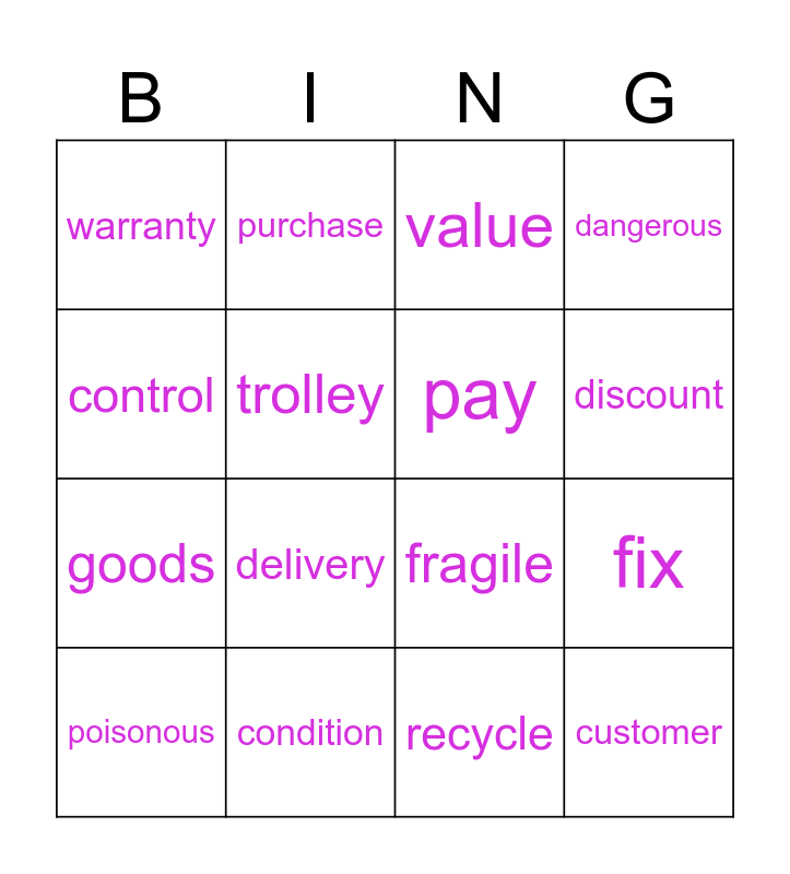 This bingo card has 16 words: condition, fix, value, warranty, goods, purchase, fragile, recycle, control, trolley, poisonous, dangerous, delivery, discount, pay and customer.