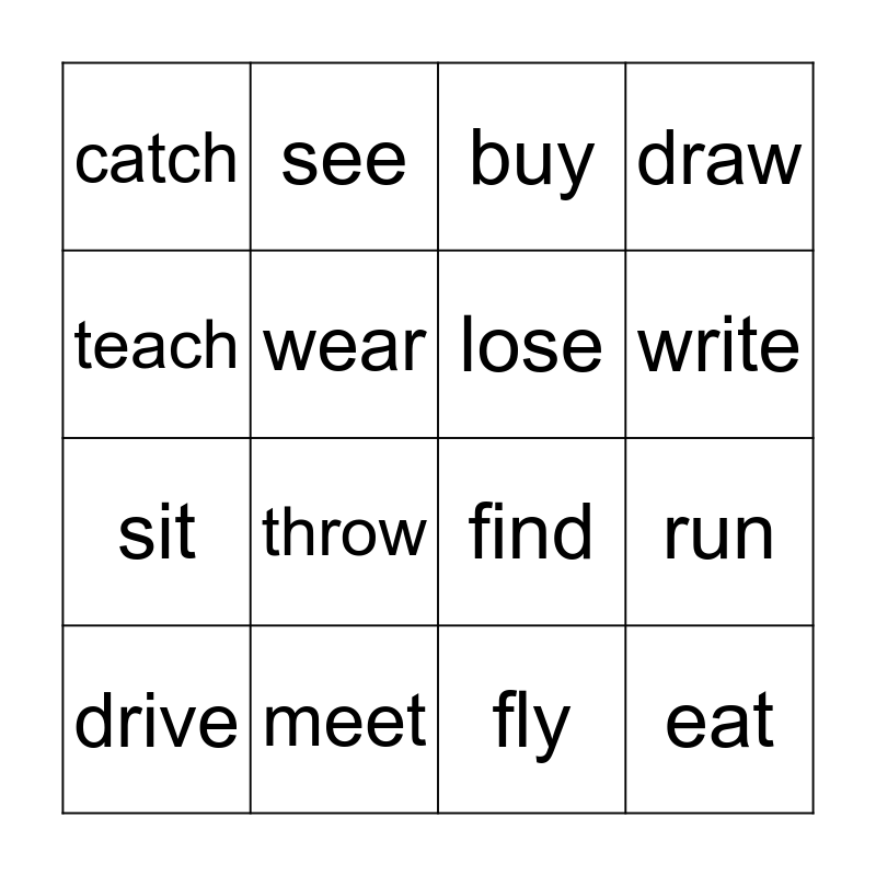 This bingo card has 16 words: meet, run, buy, catch, sit, see, find, fly, teach, wear, drive, draw, throw, write, lose and eat.