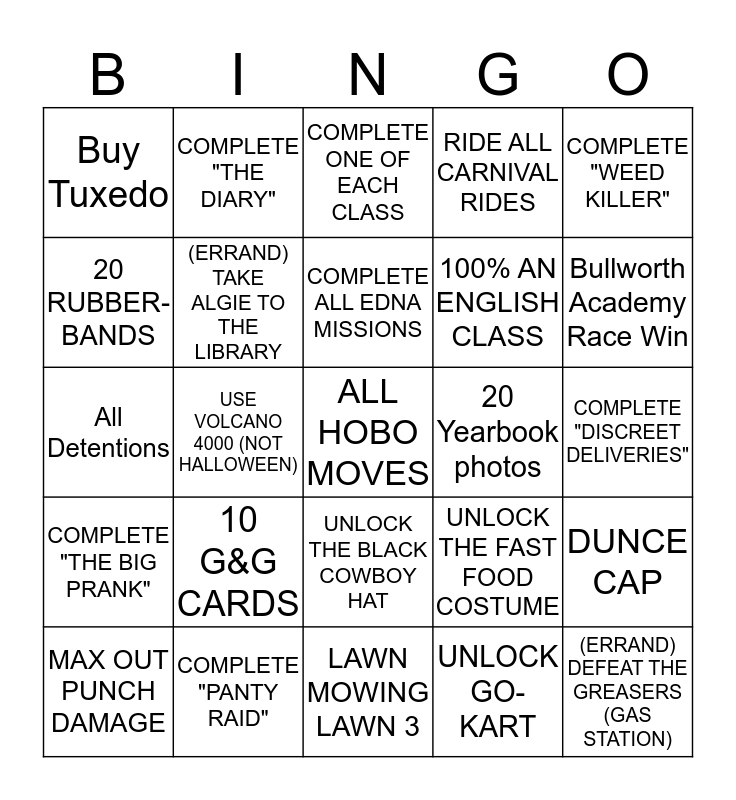 This bingo card has 25 words: 10 G&G CARDS, LAWN MOWING LAWN 3, COMPLETE ALL EDNA MISSIONS, MAX OUT PUNCH DAMAGE, COMPLETE "WEED KILLER", Buy Tuxedo, 20 RUBBER-BANDS, COMPLETE "THE DIARY", 20 Yearbook photos, UNLOCK THE BLACK COWBOY HAT, 100% AN ENGLISH CLASS, All Detentions, UNLOCK THE FAST FOOD COSTUME, DUNCE CAP, (ERRAND) TAKE ALGIE TO THE LIBRARY, (ERRAND) DEFEAT THE GREASERS (GAS STATION), COMPLETE "DISCREET DELIVERIES", COMPLETE ONE OF EACH CLASS, Bullworth Academy Race Win, USE VOLCANO 4000 (NOT HALLOWEEN), ALL HOBO MOVES, COMPLETE "PANTY RAID", COMPLETE "THE BIG PRANK", RIDE ALL CARNIVAL RIDES and UNLOCK GO-KART.