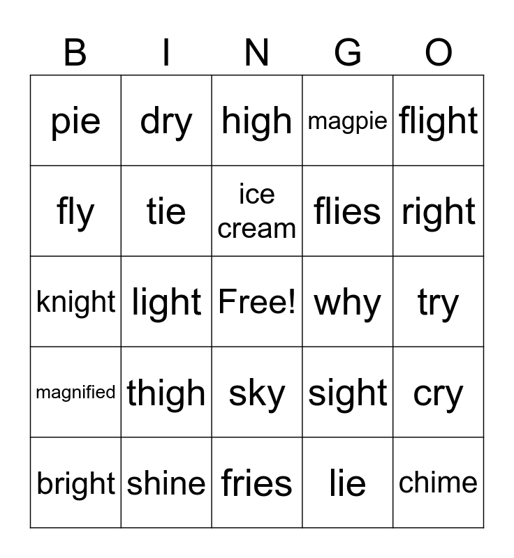 This bingo card has a free space and 24 words: thigh, shine, ice cream, bright, flight, pie, fly, dry, why, sky, flies, knight, sight, cry, tie, lie, try, high, right, light, chime, magnified, magpie and fries.