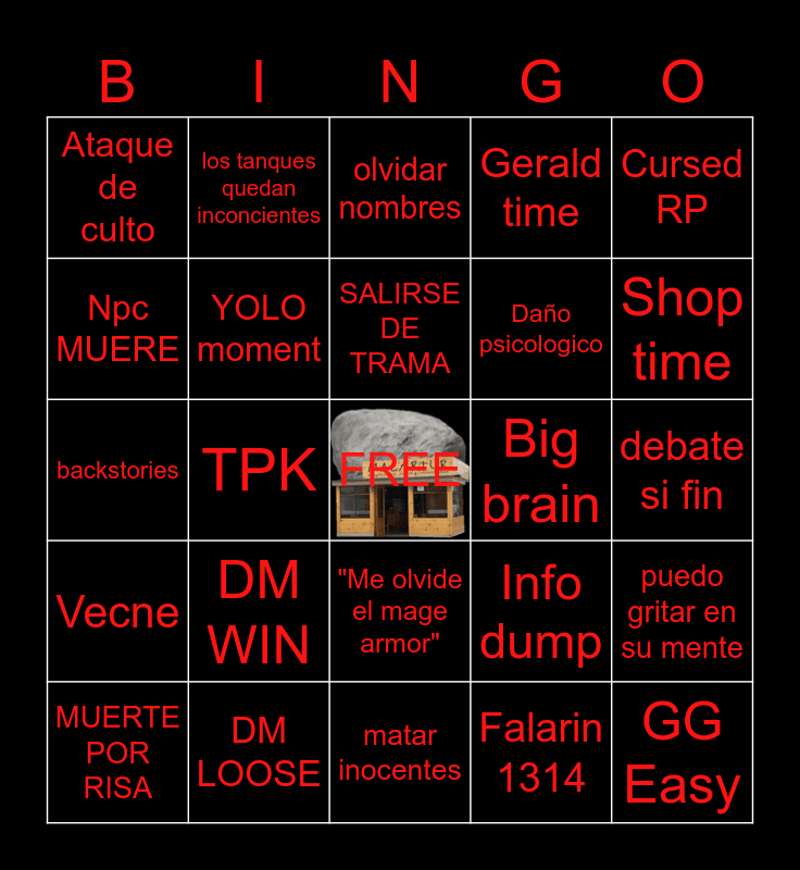 This bingo card has a free space and 24 words: DM WIN, DM LOOSE, SALIRSE DE TRAMA, MUERTE POR RISA, Cursed RP, Ataque de culto, Npc MUERE, los tanques quedan inconcientes, Big brain, "Me olvide el mage armor", Daño psicologico, backstories, Info dump, puedo gritar en su mente, YOLO moment, Falarin 1314, debate si fin, olvidar nombres, Shop time, TPK, GG Easy, Vecne, Gerald time and matar inocentes.
