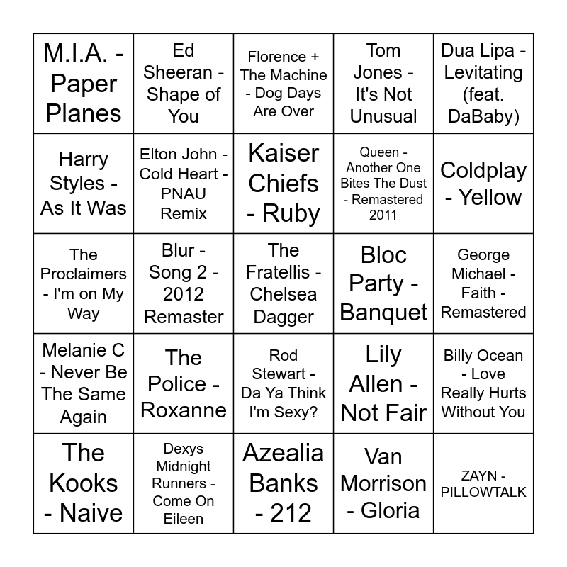 This bingo card has 57 words: Franz Ferdinand - Take Me Out, The Kooks - Naive, Foals - My Number, M.I.A. - Paper Planes, Azealia Banks - 212, Spice Girls - Stop, Elton John - Cold Heart - PNAU Remix, Oasis - Don't Look Back in Anger - Remastered, Queen - Another One Bites The Dust - Remastered 2011, David Bowie - Golden Years - 2016 Remaster, Tom Jones - It's Not Unusual, Gorillaz - Clint Eastwood, Robbie Williams - Rock DJ, Donna Lewis - I Love You Always Forever, Amy Winehouse - Rehab, The Clash - London Calling - Remastered, Dua Lipa - Levitating (feat. DaBaby), Blur - Song 2 - 2012 Remaster, Arctic Monkeys - R U Mine?, The Fratellis - Chelsea Dagger, Bloc Party - Banquet, Mylo - Drop the Pressure, Lily Allen - Not Fair, Florence + The Machine - Dog Days Are Over, Eurythmics - Sweet Dreams (Are Made of This), Kaiser Chiefs - Ruby, The Smiths - How Soon Is Now?, Edwyn Collins - A Girl Like You, Coldplay - Yellow, Duran Duran - Girls on Film, The Cure - Friday I'm In Love, Led Zeppelin - Immigrant Song, The Who - Baba O'Riley, The Beatles - Come Together, George Michael - Faith - Remastered, Harry Styles - As It Was, Adele - Rolling in the Deep, The Proclaimers - I'm on My Way, Black Sabbath - Iron Man, Melanie C - Never Be The Same Again, Ed Sheeran - Shape of You, Rod Stewart - Da Ya Think I'm Sexy?, ZAYN - PILLOWTALK, Seal - Kiss from a Rose, Yusuf / Cat Stevens - Wild World, Sade - Smooth Operator - Single Version, The Police - Roxanne, Dexys Midnight Runners - Come On Eileen, Charli XCX - Boom Clap, Pink Floyd - Another Brick in the Wall, Pt. 2, Stormzy - Vossi Bop, Van Morrison - Gloria, James Blunt - Goodbye My Lover, Robert Palmer - Bad Case Of Loving You (Doctor, Doctor), Def Leppard - Pour Some Sugar On Me, Billy Ocean - Love Really Hurts Without You and Rex Orange County - Best Friend.