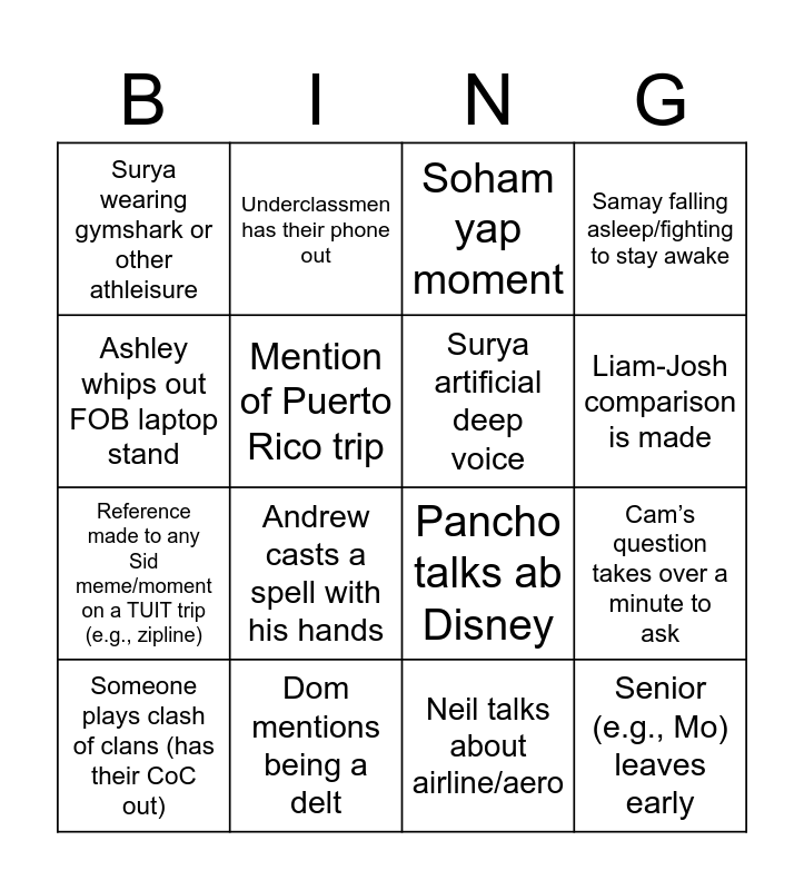 This bingo card has 16 words: Dom mentions being a delt, Cam’s question takes over a minute to ask, Soham yap moment, Surya wearing gymshark or other athleisure, Reference made to any Sid meme/moment on a TUIT trip (e.g., zipline), Underclassmen has their phone out, Pancho talks ab Disney, Neil talks about airline/aero, Ashley whips out FOB laptop stand, Mention of Puerto Rico trip, Someone plays clash of clans (has their CoC out), Samay falling asleep/fighting to stay awake, Andrew casts a spell with his hands, Liam-Josh comparison is made, Surya artificial deep voice and Senior (e.g., Mo) leaves early.