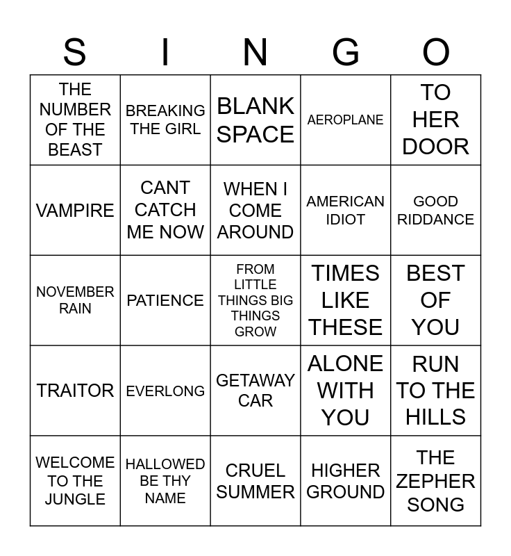 This bingo card has 25 words: EVERLONG, CRUEL SUMMER, WHEN I COME AROUND, WELCOME TO THE JUNGLE, TO HER DOOR, THE NUMBER OF THE BEAST, VAMPIRE, BREAKING THE GIRL, TIMES LIKE THESE, GETAWAY CAR, AMERICAN IDIOT, NOVEMBER RAIN, ALONE WITH YOU, RUN TO THE HILLS, CANT CATCH ME NOW, THE ZEPHER SONG, BEST OF YOU, BLANK SPACE, GOOD RIDDANCE, PATIENCE, FROM LITTLE THINGS BIG THINGS GROW, HALLOWED BE THY NAME, TRAITOR, AEROPLANE and HIGHER GROUND.