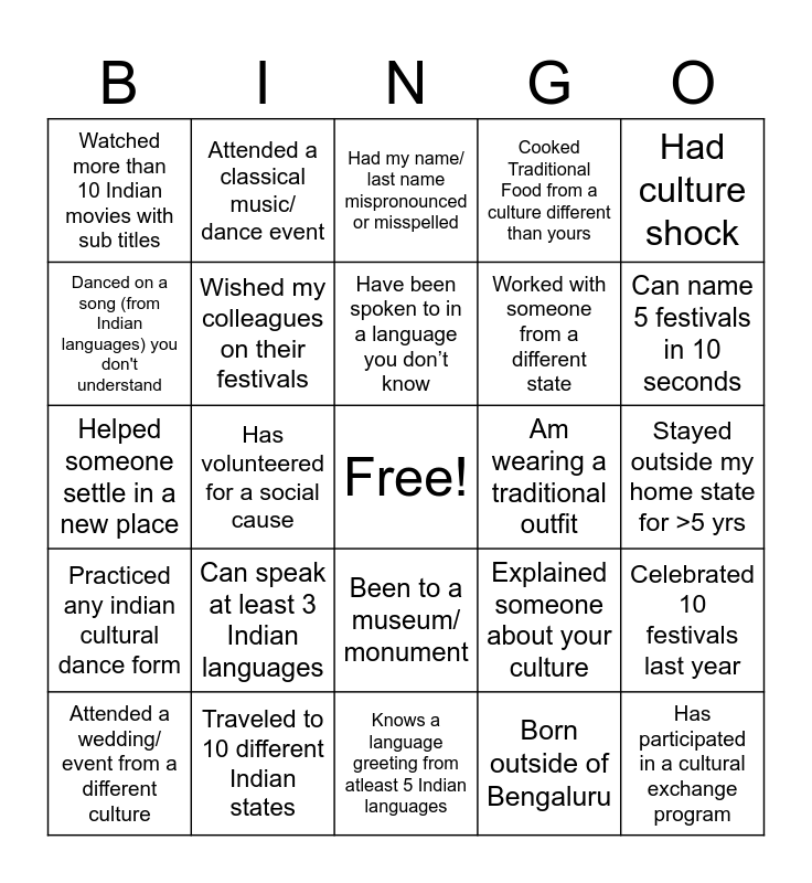 This bingo card has a free space and 24 words: Can speak at least 3 Indian languages, Traveled to 10 different Indian states, Have been spoken to in a language you don’t know, Attended a wedding/ event from a different culture, Had culture shock, Watched more than 10 Indian movies with sub titles, Danced on a song (from Indian languages) you don't understand, Attended a classical music/ dance event, Am wearing a traditional outfit, Been to a museum/ monument, Worked with someone from a different state, Helped someone settle in a new place, Explained someone about your culture, Celebrated 10 festivals last year, Wished my colleagues on their festivals, Born outside of Bengaluru, Stayed outside my home state for >5 yrs, Had my name/ last name mispronounced or misspelled, Can name 5 festivals in 10 seconds, Has volunteered for a social cause, Has participated in a cultural exchange program, Practiced any indian cultural dance form, Cooked Traditional Food from a culture different than yours and Knows a language greeting from atleast 5 Indian languages.